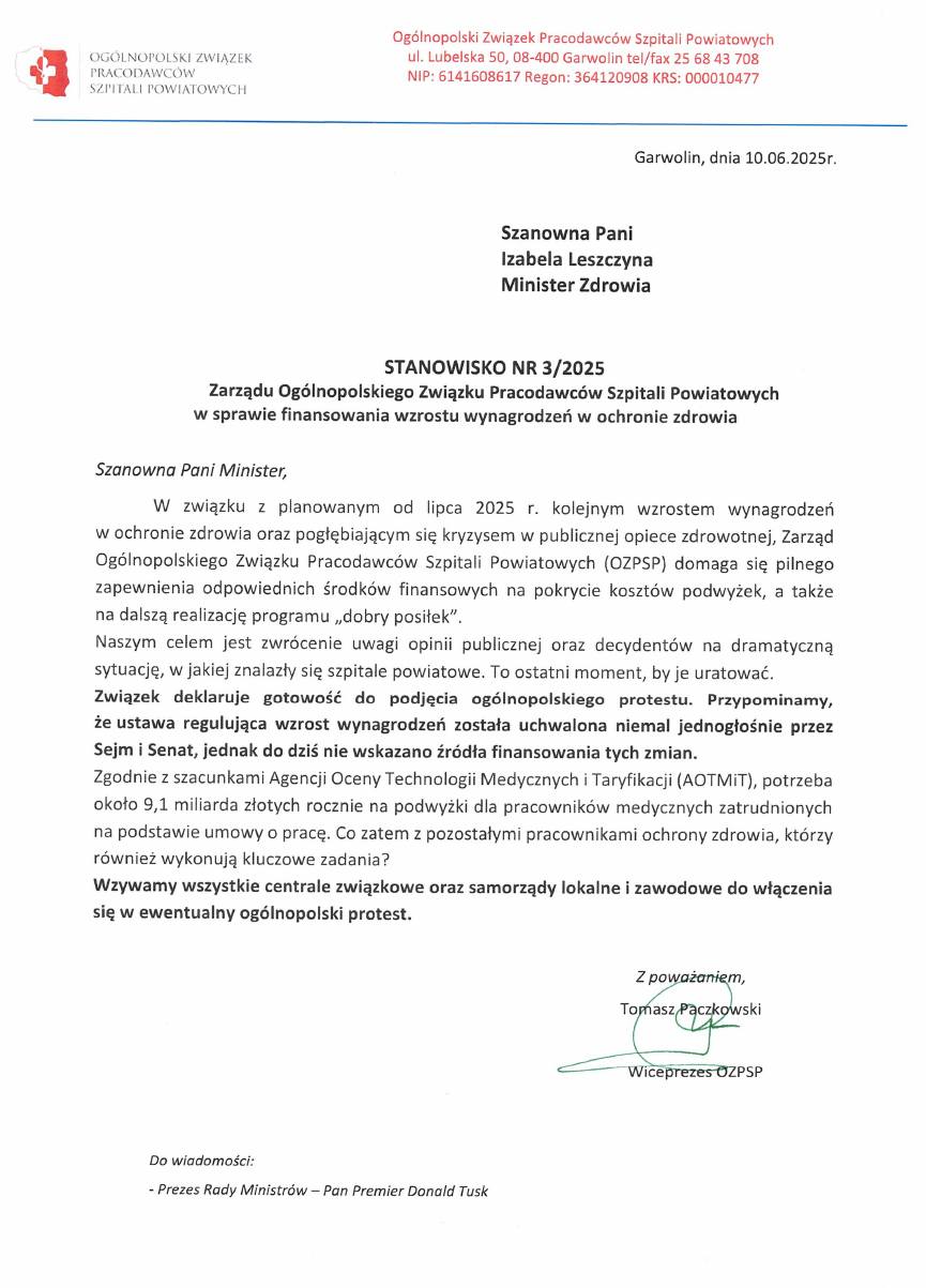 W związku z planowanym od lipca 2025 r. kolejnym wzrostem wynagrodzeń w ochronie zdrowia oraz pogłębiającym się kryzysem w publicznej opiece zdrowotnej, Zarząd Ogólnopolskiego Związku Pracodawców Szpitali Powiatowych (OZPSP) domaga się pilnego zapewnienia odpowiednich środków finansowych na pokrycie kosztów podwyżek, a także na dalszą realizację programu „dobry posiłek”.